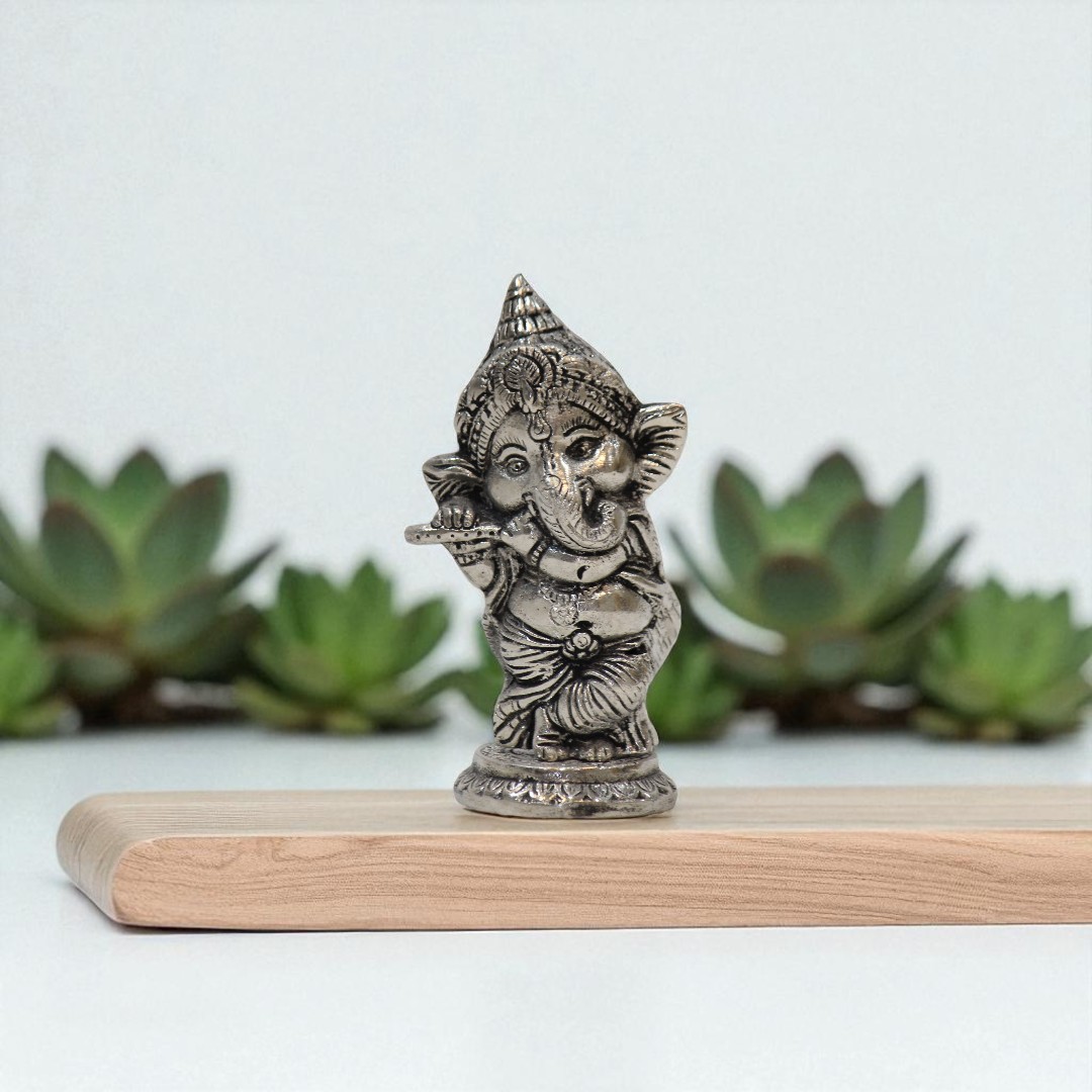 Silver-Plated Lord Ganesha Playing Flute Idol – Aluminium Statue for Home Decor and Spiritual Gifting