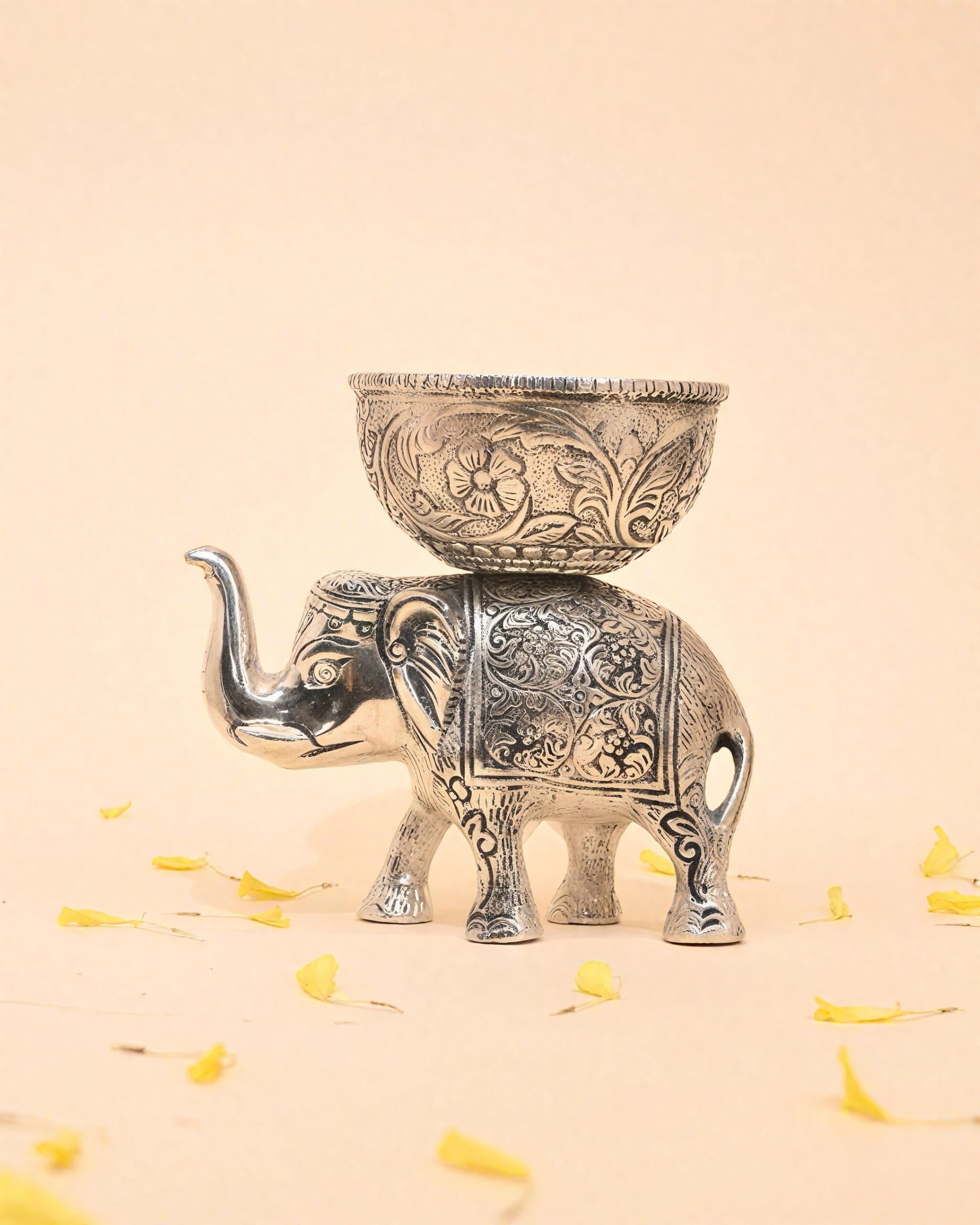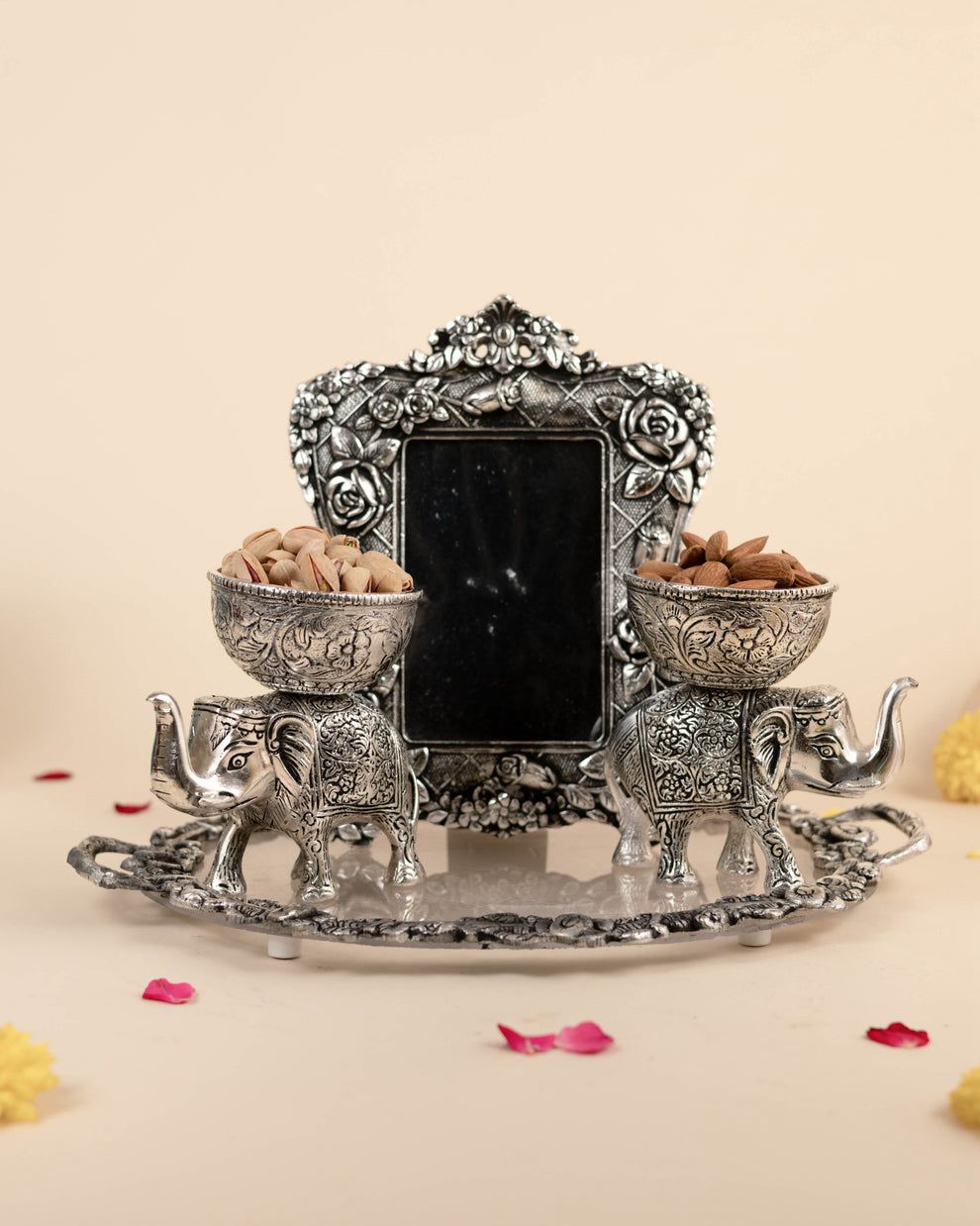 Our Photoframe Hamper Set is more than just a gift—it’s a blend of beauty, culture, and functionality. The German silver finish gives every item a luxurious shine, making it a keepsake that lasts for years. The upward trunk elephant bowl is especially significant, as it represents blessings, prosperity, and strength in Vastu and Indian tradition.