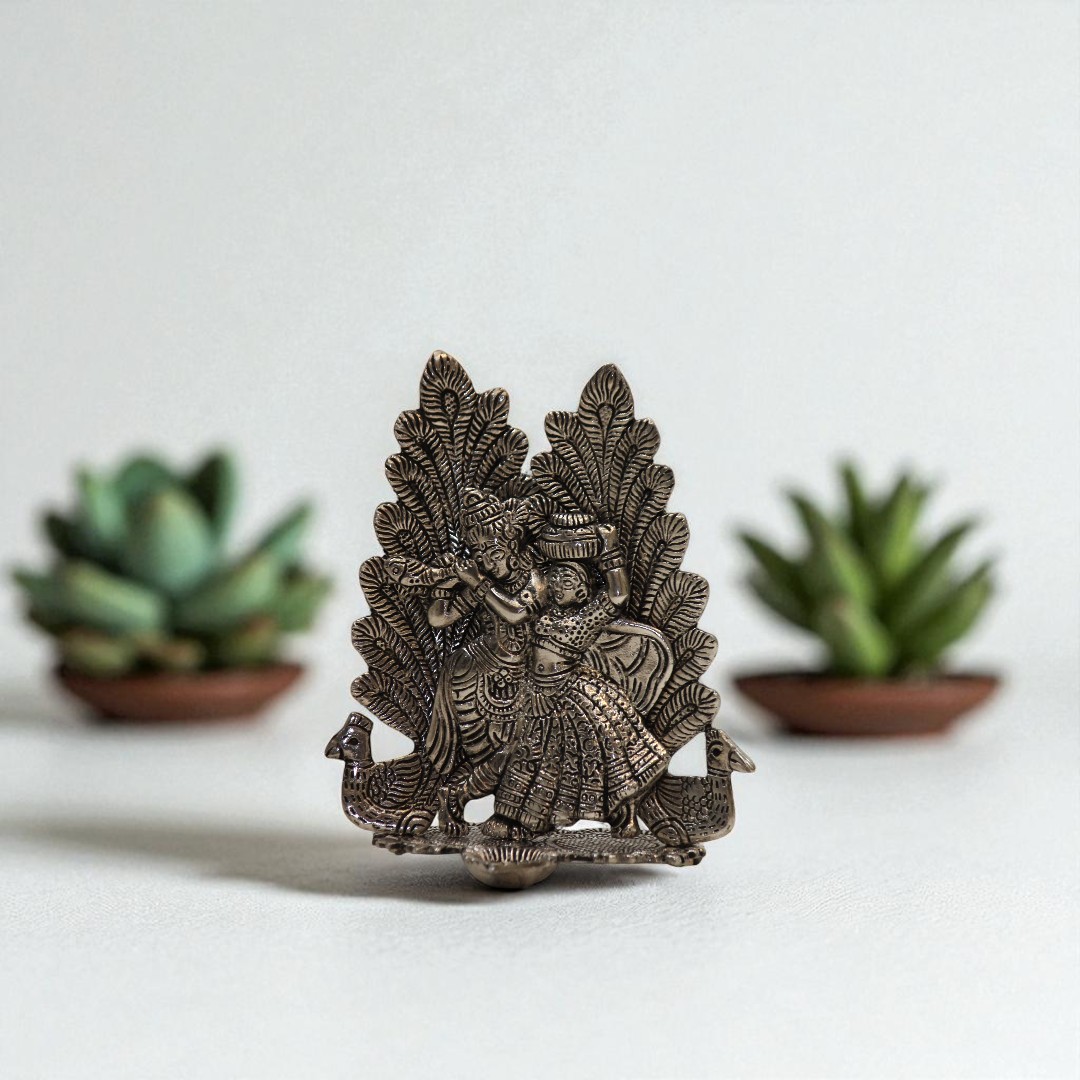 silver polish metal articles are decorative items made from metal and finished with a silver polish to give them a luxurious and elegant appearance. These articles can be used for various purposes, such as home decor, office table decor, or as gift items.Create a stunning focal point in your home with the Peacock Radhe Krishna Diya, a magnificent piece of artistry that radiates elegance and refinement. Its striking peacock design and intricate craftsmanship will bring a sense of opulence to any space, making it an ideal piece to elevate any sacred area. This diya stands dignified in its beauty, ready to illuminate your home in style.
